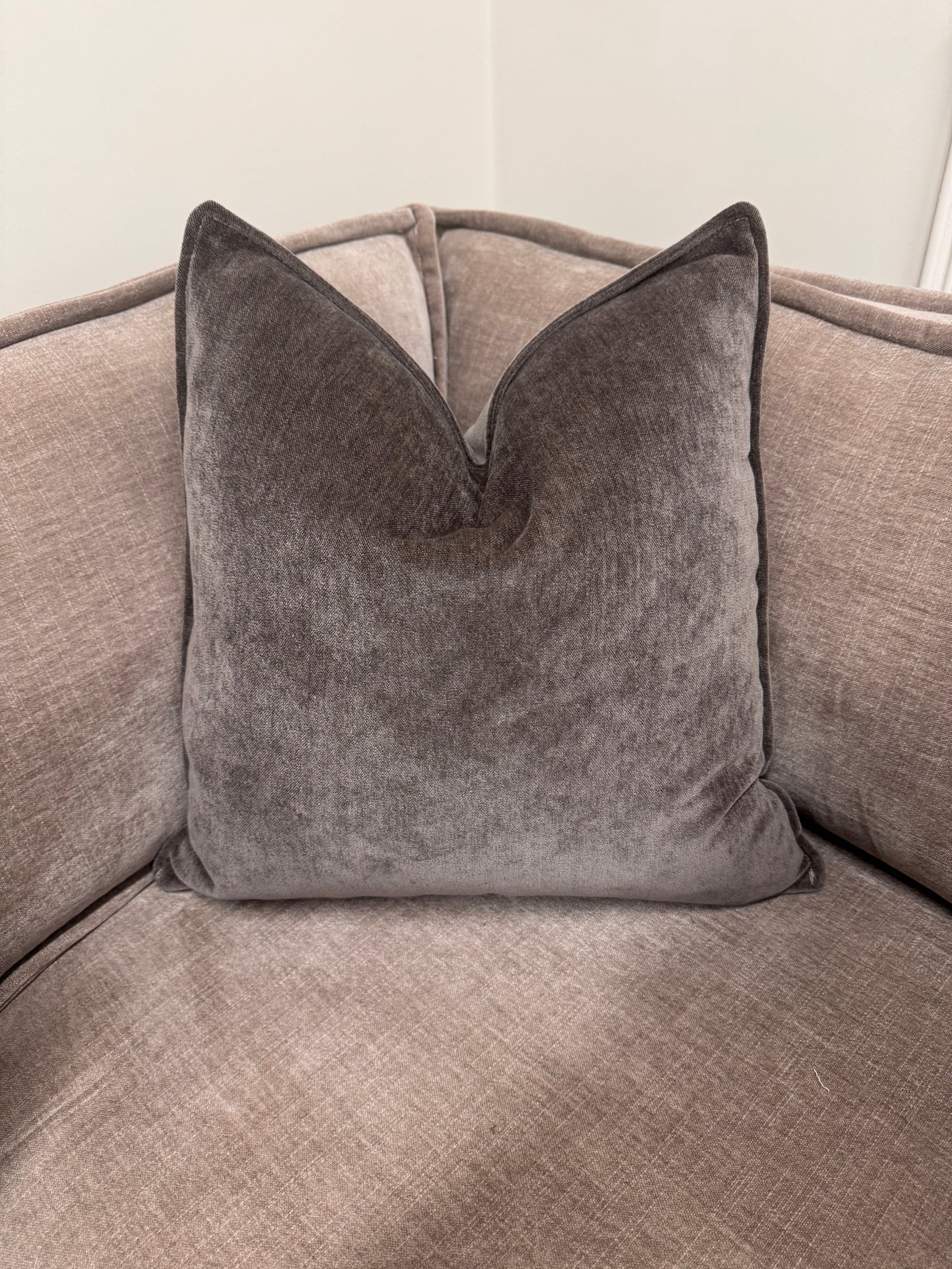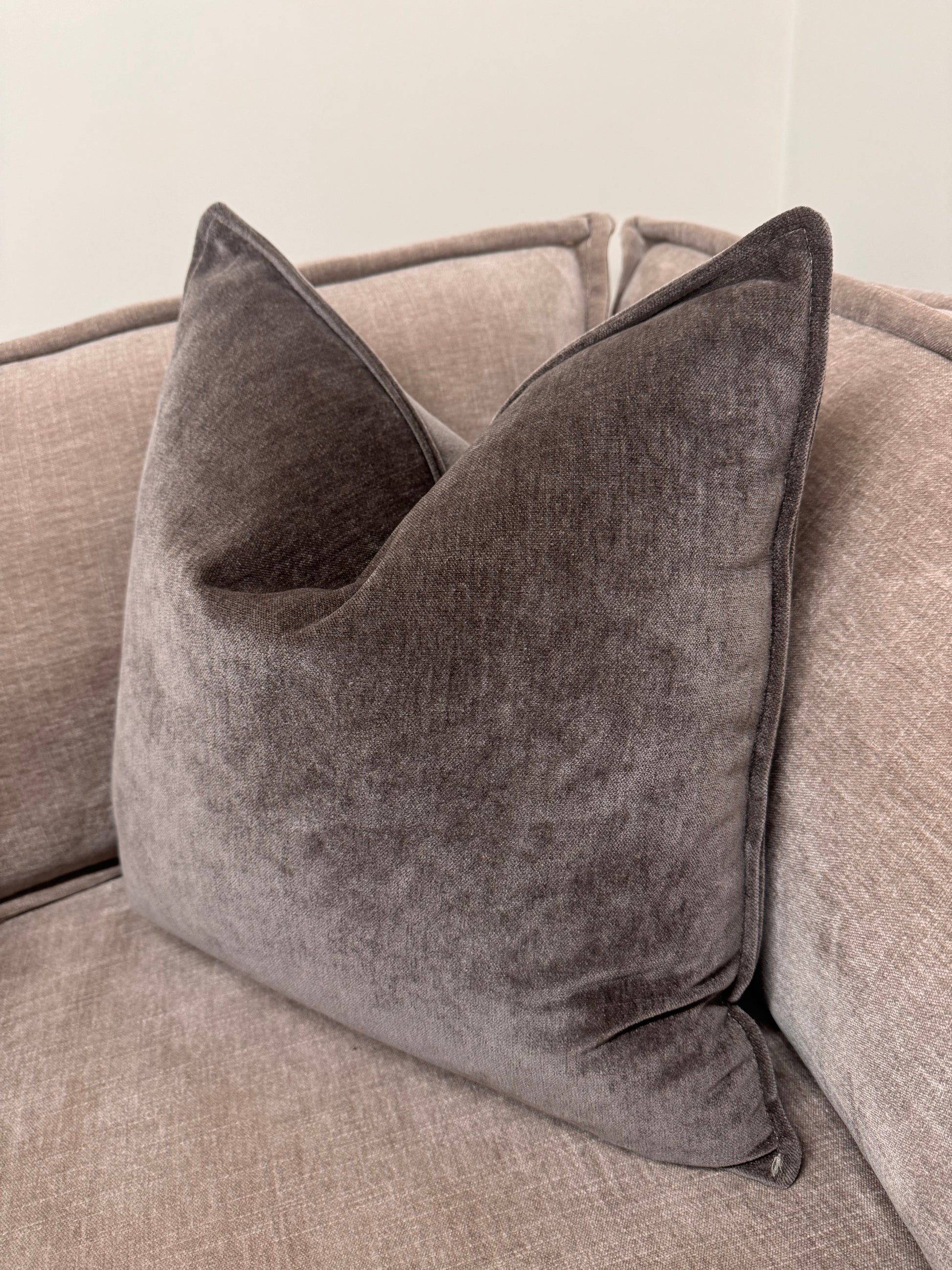 A soft mocha cushion with a velvety finish, designed to bring warmth, balance, and effortless comfort to modern living spaces.