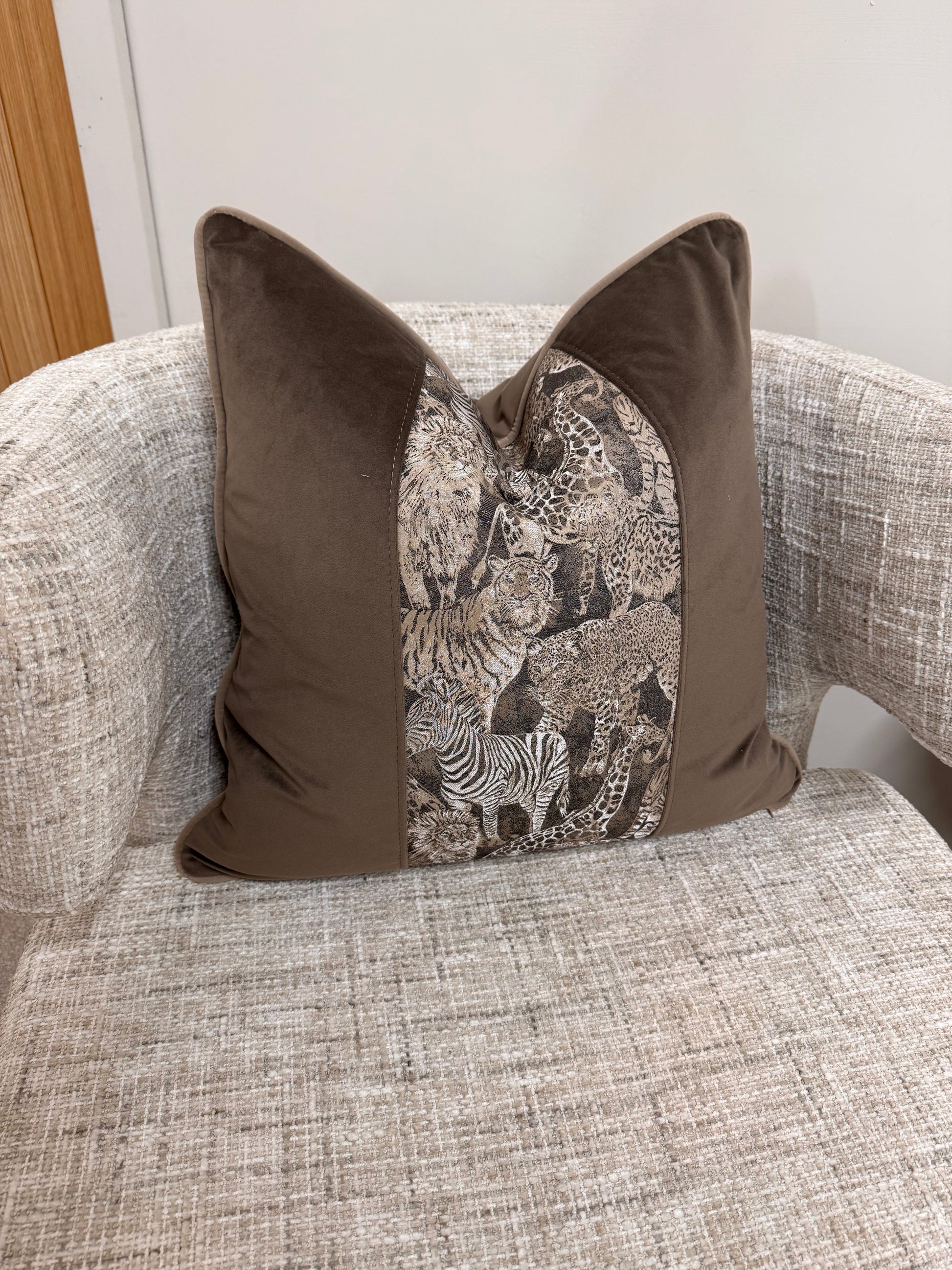 A refined luxury scatter cushion combining a plush velvet surround with a bold safari-inspired centre panel. Designed to add depth and texture to modern interiors, it’s finished with a feather-filled inner for exceptional comfort and structure.