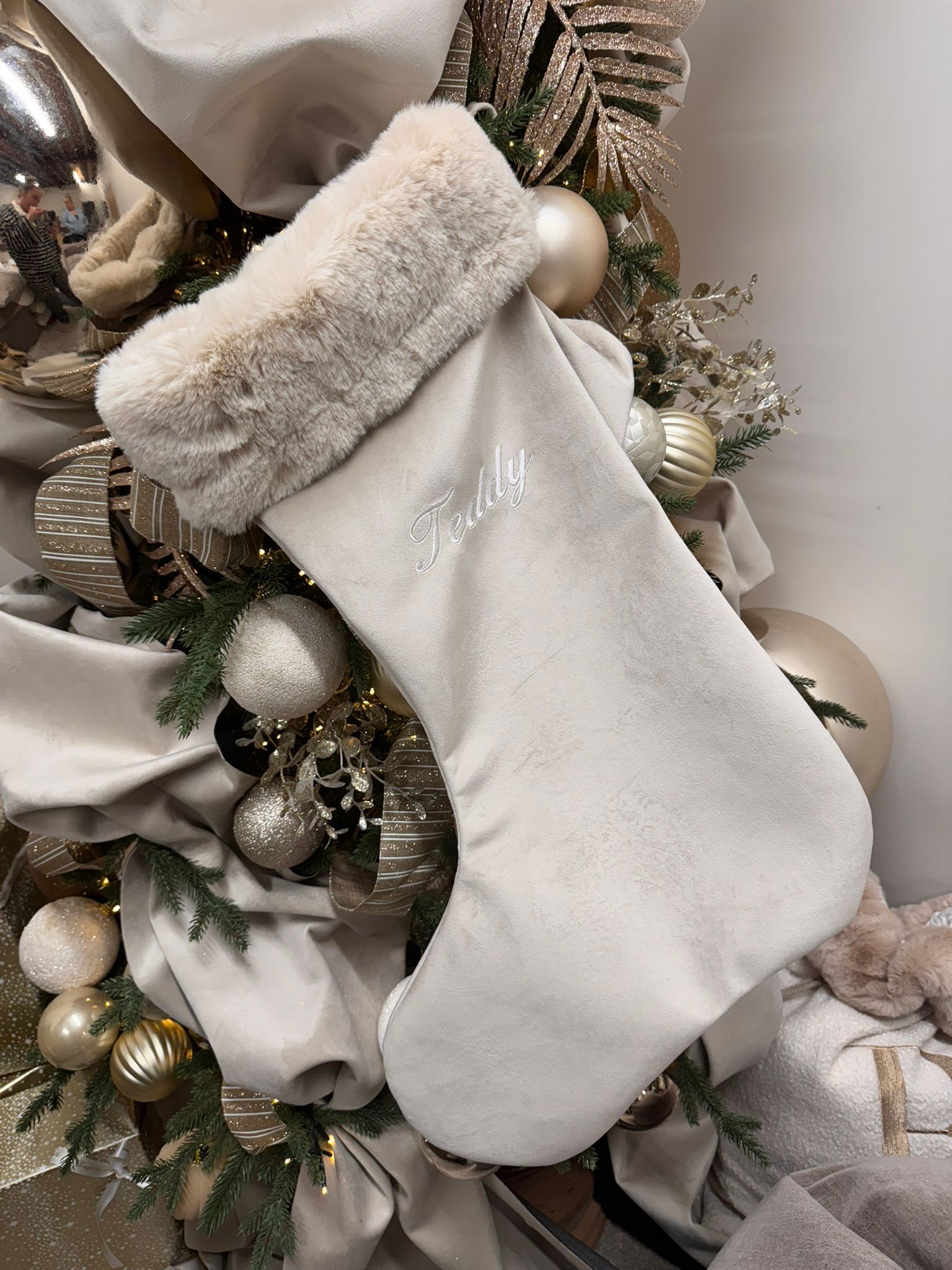 Customise it with a name embroidered across the top, creating a keepsake that can be treasured year after year. Perfect for hanging by the fireplace or under the tree, it’s a charming way to make every family member feel part of the magic.